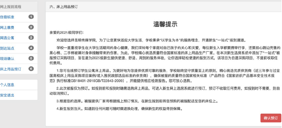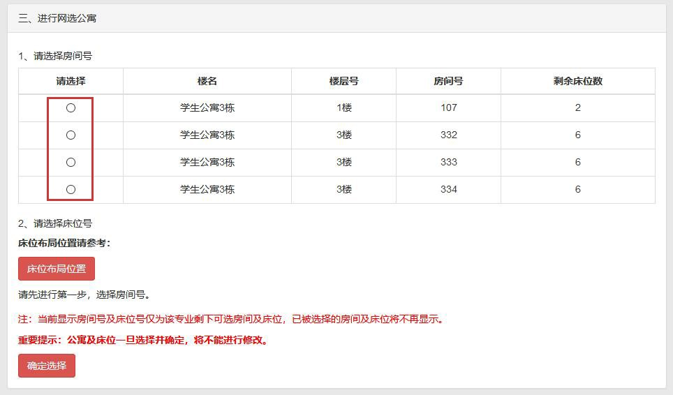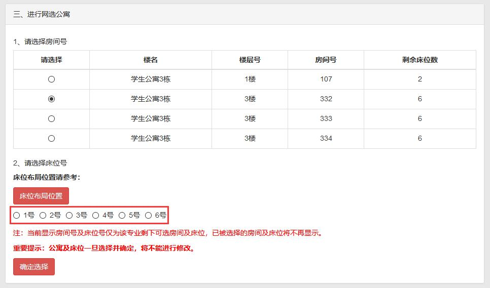 选择您喜欢的床位号后点击“确定选择”按钮即可完成公寓及床位选择。