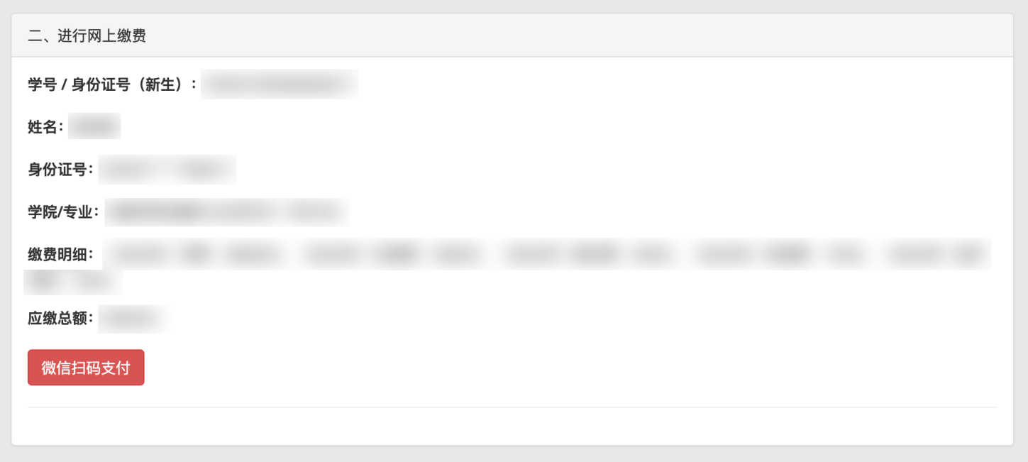 当住宿标准确定后,点击第二步网上缴费,缴费需分两笔进行支付,第一笔支付费用为相关代收费用,第二笔支付费用为学费和住宿费。在每笔费用支付时,页面均会列出您所需缴纳相关费用明细以及您的个人基本信息,请认真仔细核对相关个人信息及费用明细信息是否正确,确认无误后,请点击下图所示“微信扫码支付”按钮。缴费分为两步,第一步是代收费,第二步是住宿费和学费。