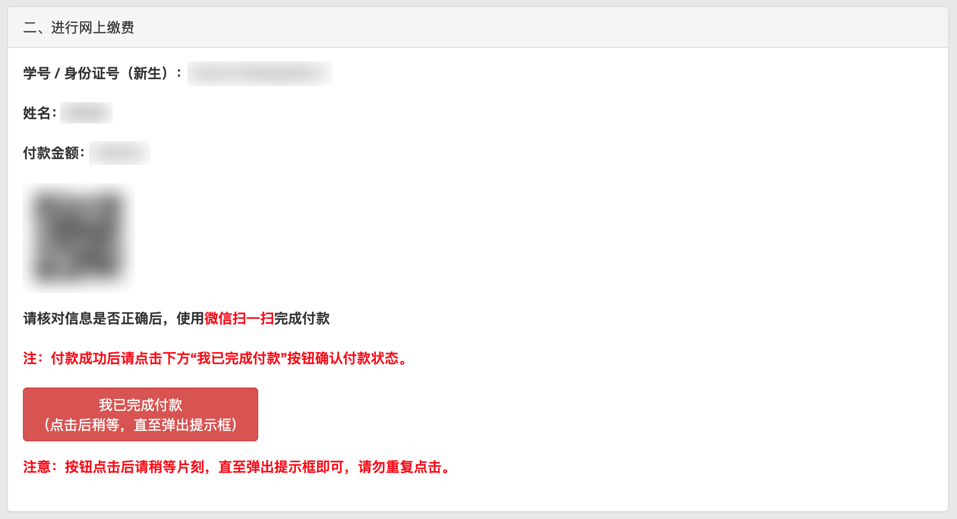 1、点击按钮后,页面再次显示个人信息、费用信息和微信付款二维码,如下图所示: