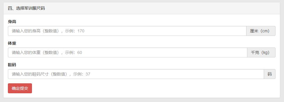 此时,您需要填写身高、体重和鞋码即可,单位分别为厘米、千克和码,请直接填写整数即可,例如您可以在身高栏填写 180,体重栏填写 70,鞋码栏填写 41,填写好后点击“确定提交”按钮即可。