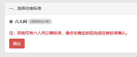 点击第一步:住宿标准,界面如下图所示,请选中六人间(当空心圆变为实心圆时即为选中),然后点击“确定”按钮。