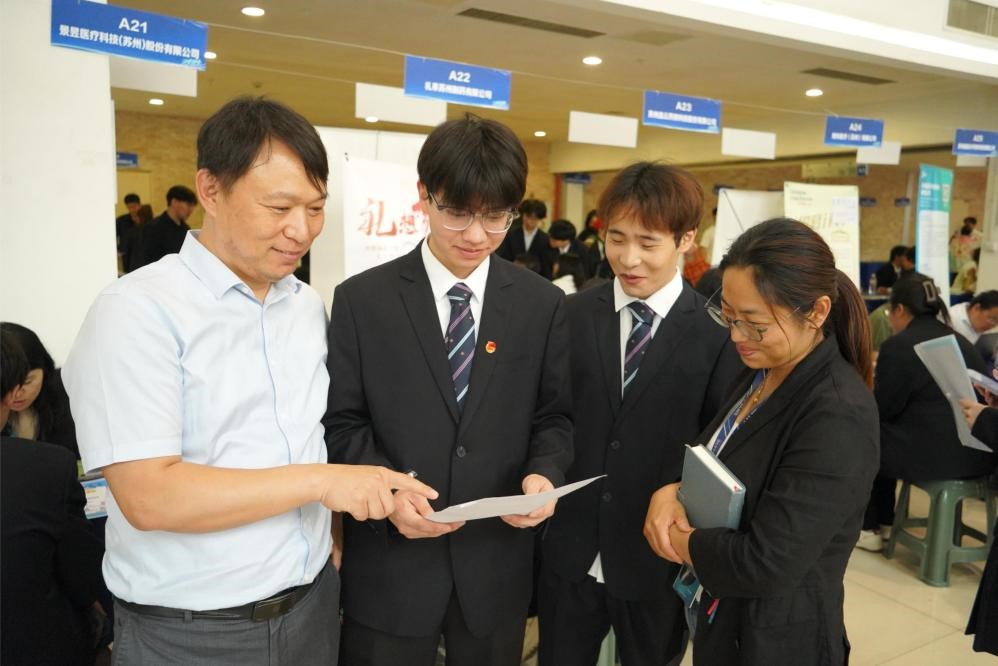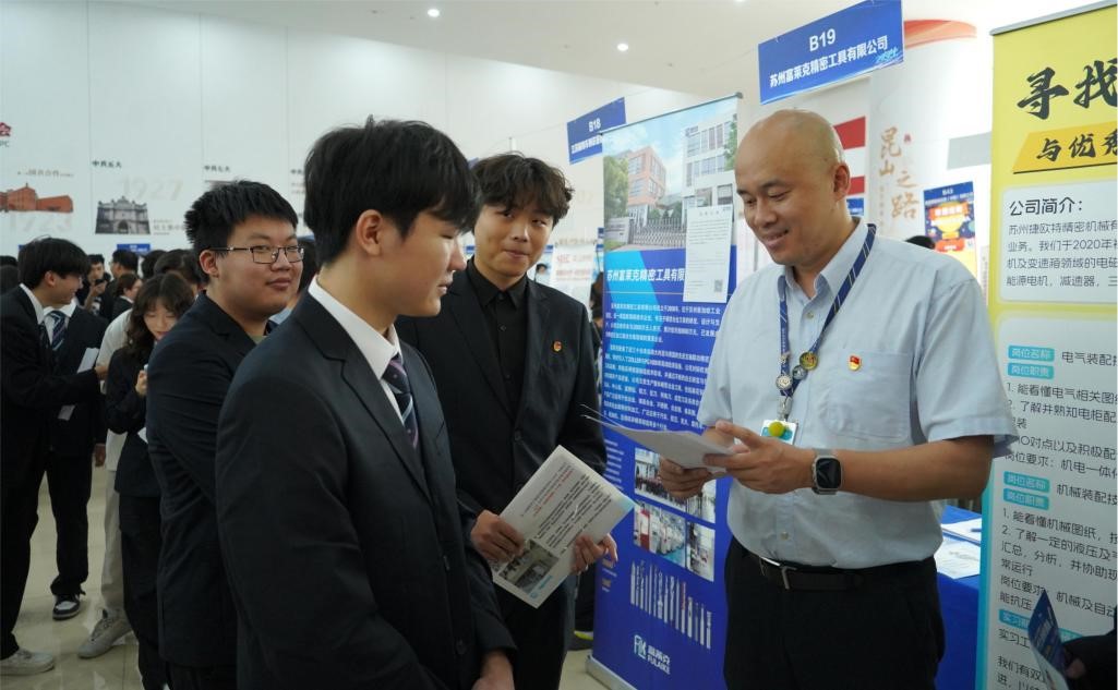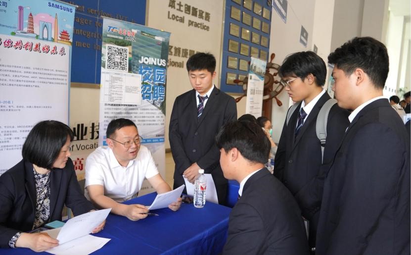 5月28日,服务新质生产力 校地强链促就业——江苏省“百校联动”校园招聘活动暨2025年学校大型校园招聘会在A1楼大厅顺利举办。本次招聘会共吸引博世汽车部件(苏州)有限公司、三星电子(苏州)半导体有限公司、谷轮环境科技(苏州)有限公司、苏州通富超威半导体有限公司、苏州易德龙科技股份有限公司、帕玛斯韦奇航空部件(苏州)有限公司、日立电梯(中国)有限公司苏州分公司、中亿丰建设集团股份有限公司、红蚂蚁装饰股份有限公司等239家优质单位参加,提供岗位5000余个,涉及智能制造、人工智能、生物医药、建筑、金融、教育、旅游等多个行业,吸引3000余名学生到场求职。