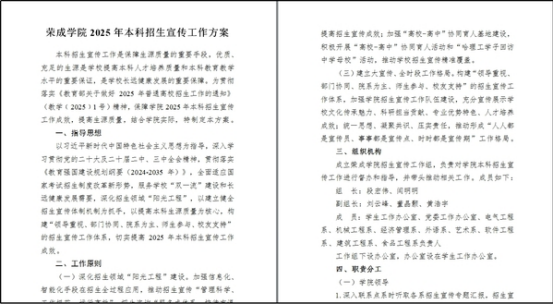 荣成学院召开党政联席会专题研讨了2025年招生宣传工作,并出台了《荣成学院2025年本科招生宣传工作方案》;成立由书记、院长担任组长,副院长、副书记为副组长,有关部门为成员单位的招生宣传工作组;要求各单位从长远健康发展的战略高度,切实履行招生宣传工作主体责任,积极主动作为,确保工作取得实效。