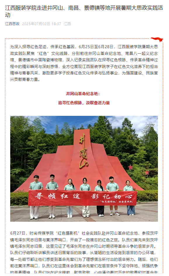 为深入探寻红色足迹,传承红色基因,6月25日至6月28日,江西服装学院暑期大思政实践队聚焦“红色”文化线路,分别前往井冈山革命纪念地、南昌八一起义纪念馆、景德镇市中国陶瓷博物馆,深入记录实践团队在探寻红色根脉、传承革命精神过程中的精彩瞬间与深刻感悟,全方位展现江西服装学院学子在红色文化滋养下的担当精神与青春风采,激励更多学子投身红色文化传承与弘扬事业,为强国建设、民族复兴贡献青春力量。