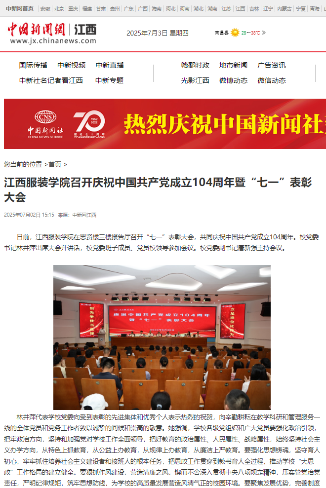 日前,江西服装学院在思贤楼三楼报告厅召开“七一”表彰大会,共同庆祝中国共产党成立104周年。校党委书记林井萍出席大会并讲话,校党委班子成员、党员校领导参加会议。校党委副书记唐新强主持会议。