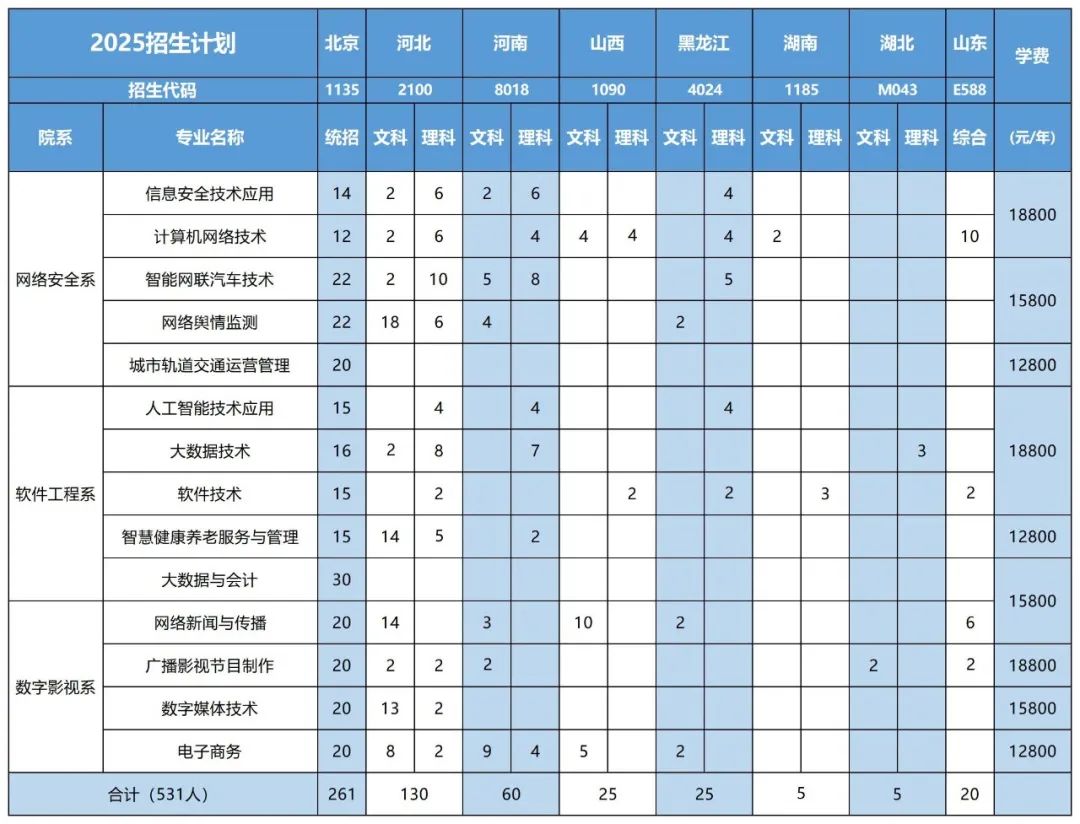 北京网络职业学院2025年普通高考面向北京、河北、河南、山东、山西、黑龙江、湖南、湖北8个省(市、自治区)招生,招生计划共计531人。