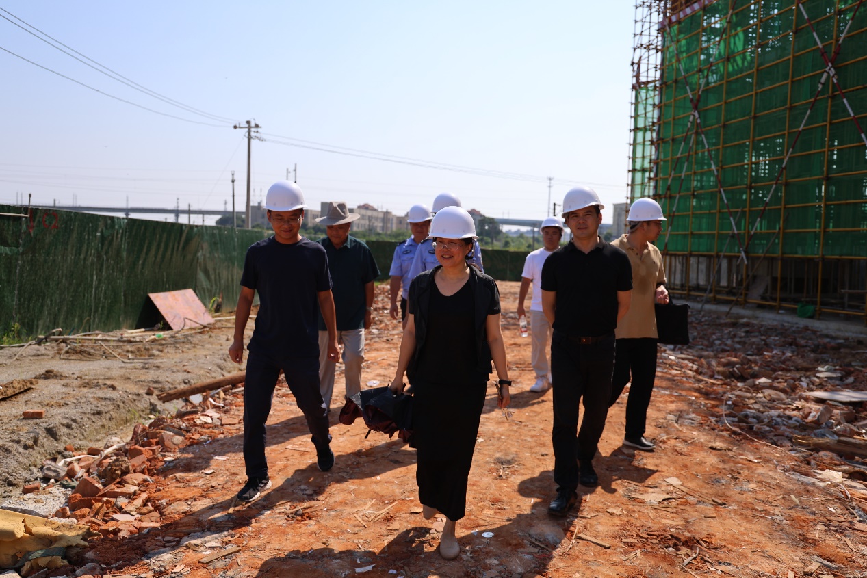 在大学生服务中心施工现场,林井萍仔细听取情况汇报,强调要加强现场安全管控,做到安全施工。