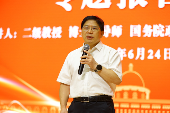 新闻中心讯(万强) 6月24日,我校在体育馆学术报告厅举行校党委理论学习中心组(扩大)第九次学习会,邀请二级教授、博士生导师、国务院政府特殊津贴专家、江西省教育厅原厅长郭杰忠作《中国式现代化与教育强国建设》专题辅导报告。校党委书记林井萍主持并讲话,全校教职员工近400人参加会议。