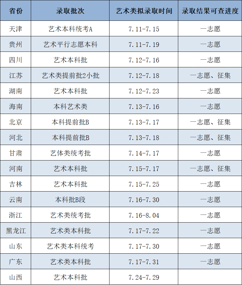 现将学院艺术类专业在各地录取时间(具体以当地公布的时间为准)及在我院网上录取结果查询的进度表公布如下: