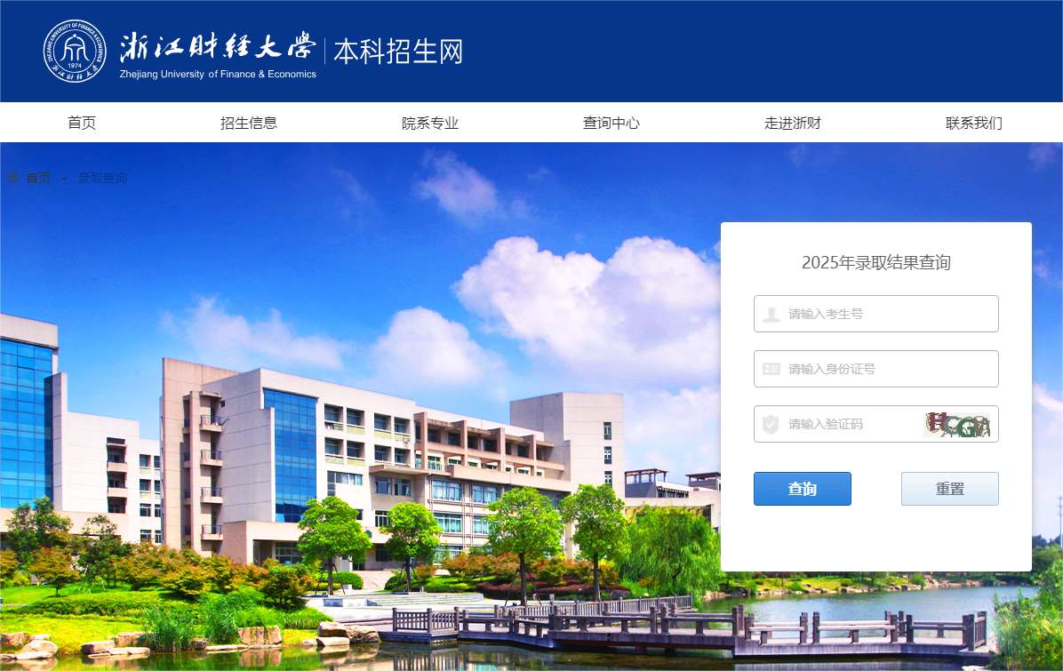 2.登录本科招生网主页:zs.zufe.edu.cn,在“查询中心”栏目点击“录取查询”,输入考生号和身份证号码查询。