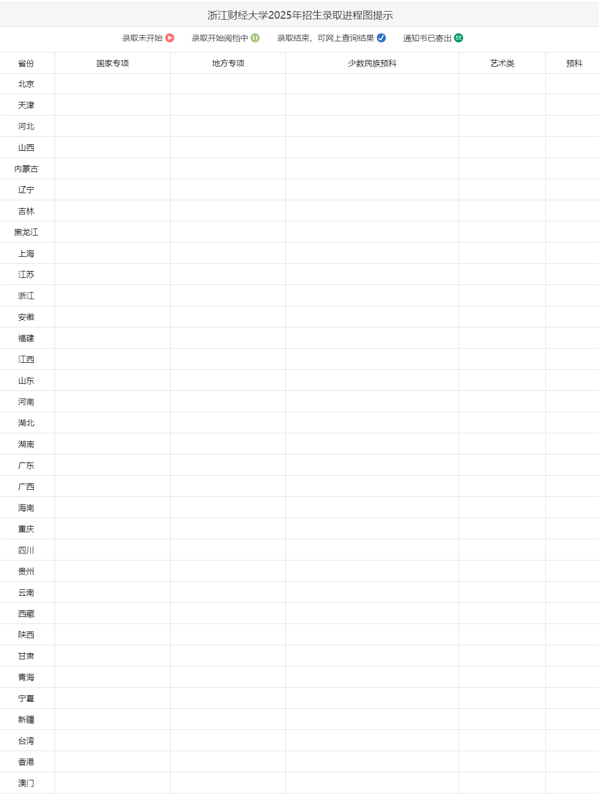 各省份录取进展及通知书邮寄情况请关注浙江财经大学2025年招生录取进程图提示。网址:http://zslqcx.zufe.edu.cn/zsw/lqcx.html