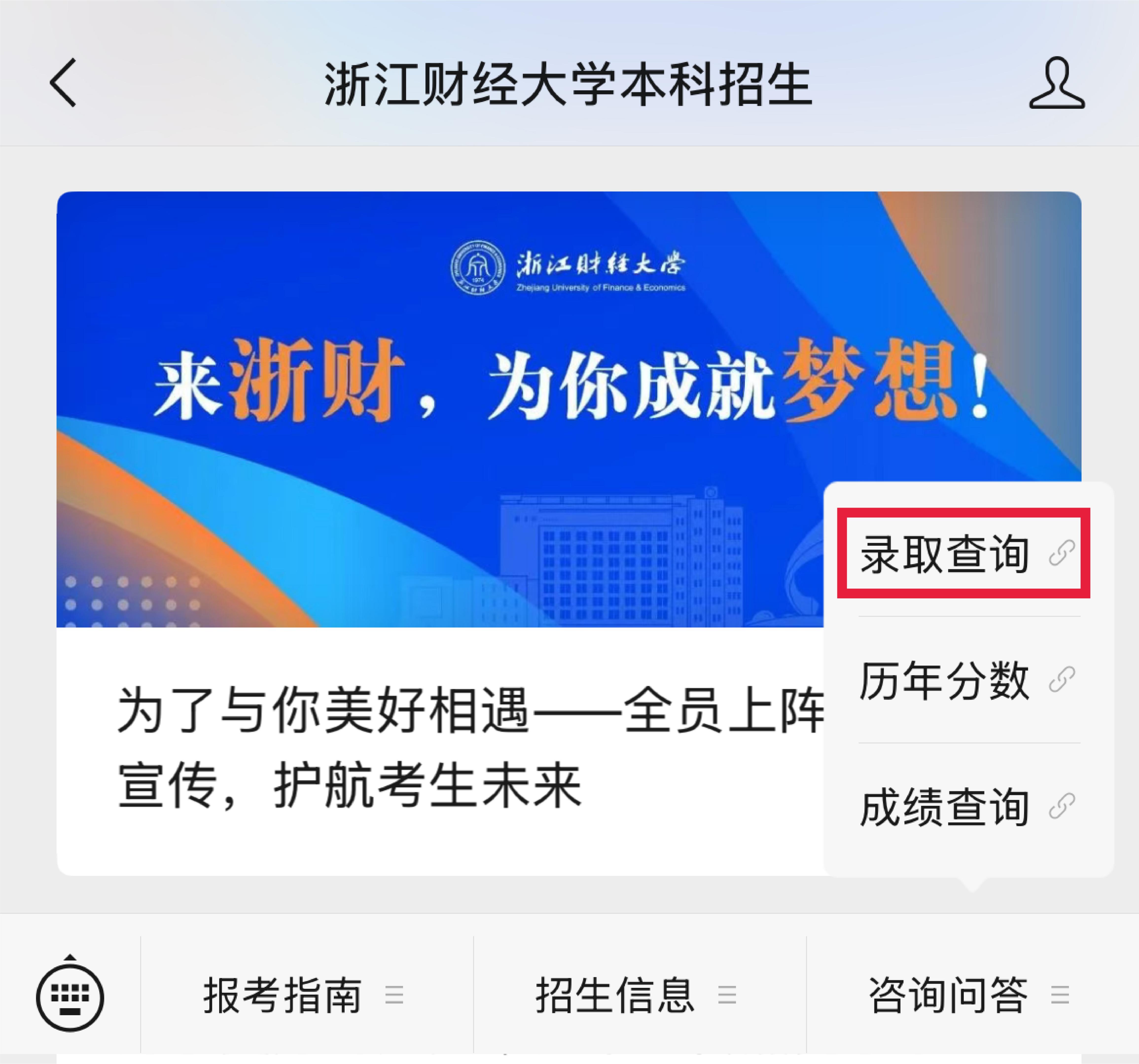 1.关注“浙江财经大学本科招生”微信公众号→咨询问答→录取查询,输入考生号和身份证号码查询。