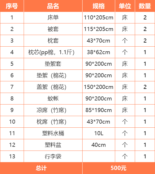 配套供应床上制品和生活用品如下(每套总价500元,17件,不单件购买)。