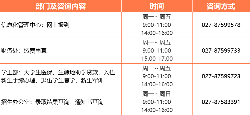 2.已应征入伍的新生或退役复学的新生,请联系学生工作处(电话:027-63492396)按学校规定及时办理保留入学资格或复学的相关手续。