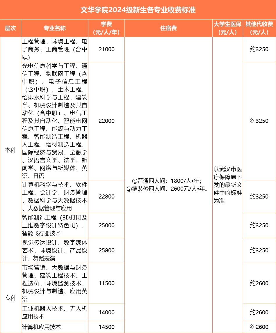 1.各专业学费、住宿费等收费项目和收费标准均已根据湖北省发改委及教育厅要求提前三十日按收费目录清单的方式在学校官网公示。