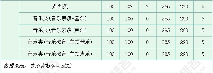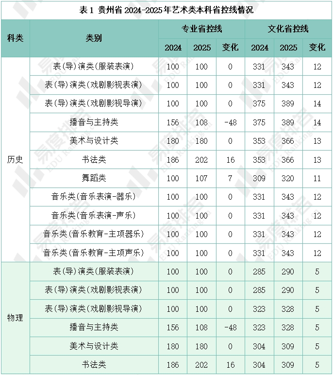 下表展示了贵州省2024-2025年艺术类本科省控线,可以看出,2025年各类别本科文化省控线较上年均有所上涨。表(导)演类、美术与设计类和音乐类的专业省控线与去年保持一致,播音与主持类本科专业省控线较去年下降幅度较大,下降了48分。