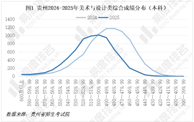 艺术类专业采用综合成绩投档,贵州省2025年美术与设计类综合成绩=高考文化总成绩×50%+(省级统考成绩÷省级统考成绩满分)×750×50%,其计算规则与2024年保持一致。从综合成绩分布情况来看,高分考生人数明显增加。各分数段考生在报考志愿时应尽量求稳,低分段考生的滑档风险较大。