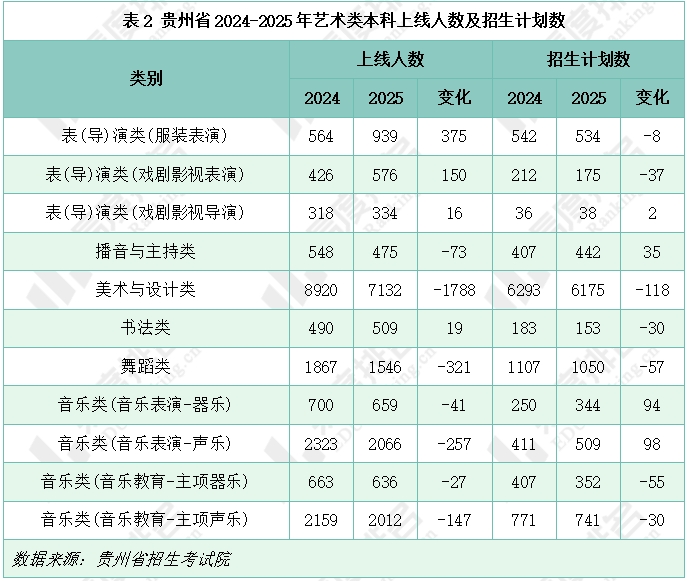 下表展示了贵州省2024-2025年艺术类本科上线人数及招生计划数。2025年表(导)演类、书法类本科上线人数较上年有所增加,其他各艺术类别的上线人数较去年均有下降,其中美术与设计类本科上线人数较上年减少了1788人。