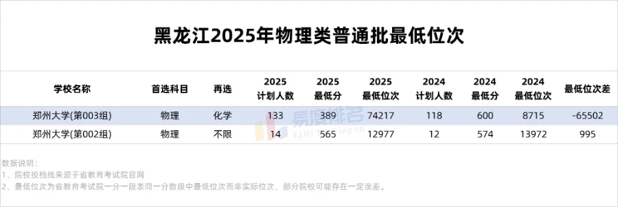 郑州大学物理类003组在黑龙江投档线仅389分,比本科线高出29分。专业组设置的严重结构性缺陷是导火索。003组将18个专业粗暴打包,涵盖物理学类、化学类、生物科学类、机械类等跨度极大的学科,其中超50%属于传统工科中的就业洼地。这种 "生化环材" 专业的集中配置,使考生面临调剂风险与专业价值的双重顾虑。