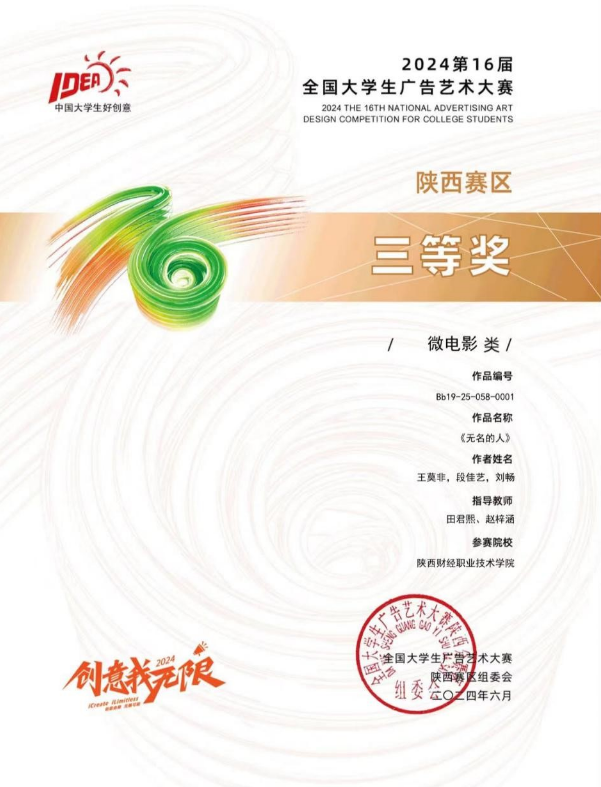 第16届全国大学生广告大赛获得(微电影类)省级三等奖