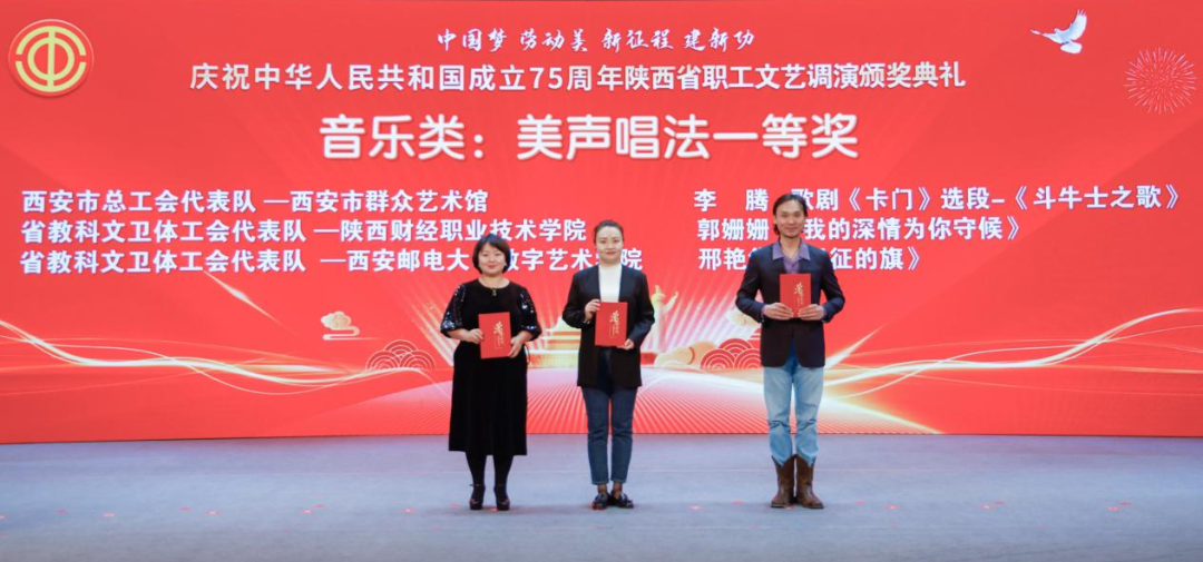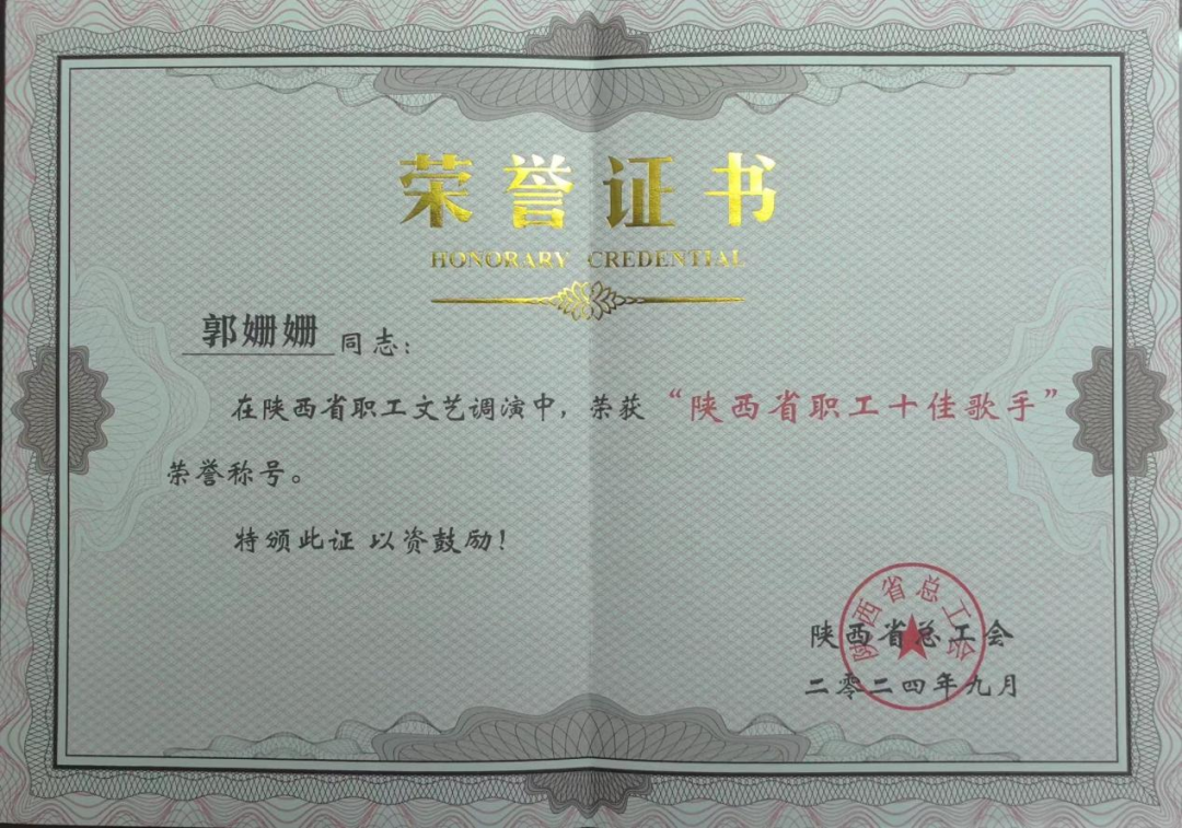 郭姗姗荣获陕西省职工文艺调演音乐类:声唱法一等奖