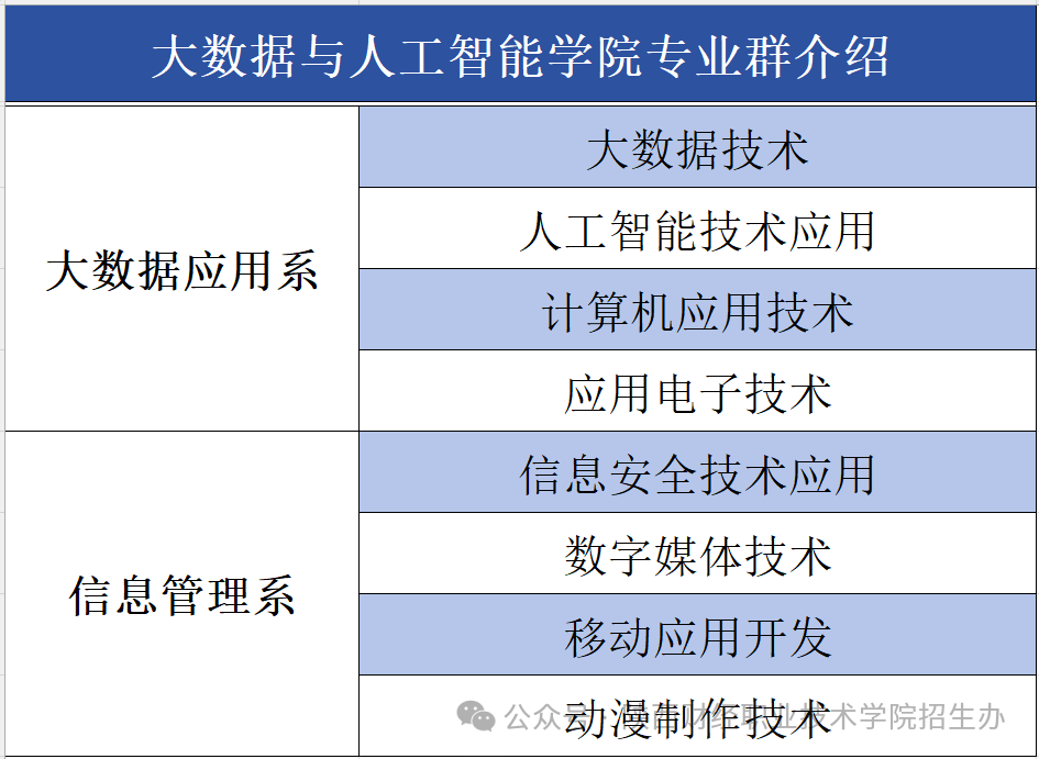 特色突出的专业:现设大数据技术、人工智能技术应用、信息安全技术应用、移动应用开发、数字媒体技术、动漫制作技术、计算机应用技术、应用电子技术8个专业,对接国家产业振兴计划,服务区域经济发展。