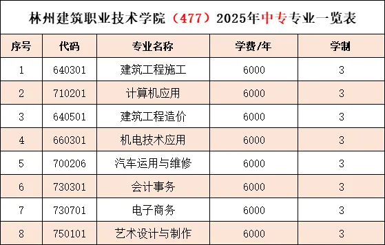 林州建筑职业技术学院中专部以“传承和弘扬红旗渠精神培育新时代建设人才”为己任,坚持“为学生搭建升学平台,为社会造就专业人才”的办学宗旨,培养其参加对口升学、单招考试,升入高等院校深造,最终打造成为立足安阳,面向河南,辐射全国,主动适应区域经济建设和社会发展需要,培养“素质全面、基础扎实、技能过硬、社会需要”的具有工匠精神和社会责任感的技术技能型人才。学院专业优势突出,特色鲜明,现开设8个中专专业、4个五年一贯制大专专业,其中中专专业分别是:建筑工程施工、计算机应用、建筑工程造价、会计事务、电子商务、机电技术应用、汽车运用与维修、艺术设计与制作;五年一贯制大专专业分别是:计算机应用技术、艺术设计、建筑工程技术、大数据与会计。
