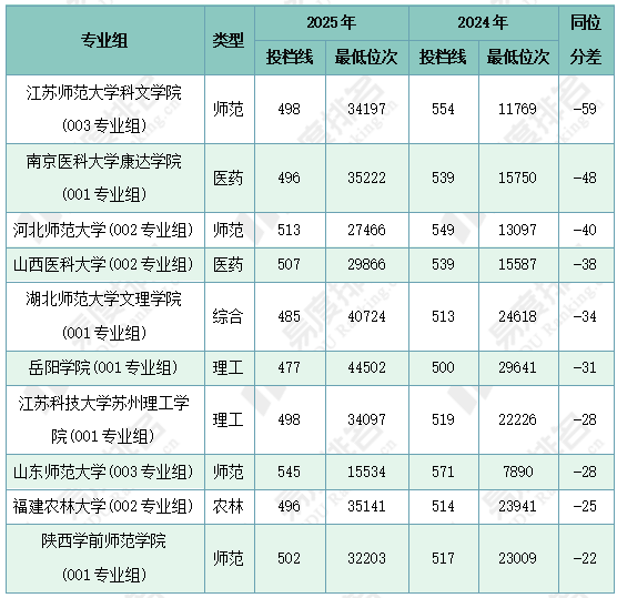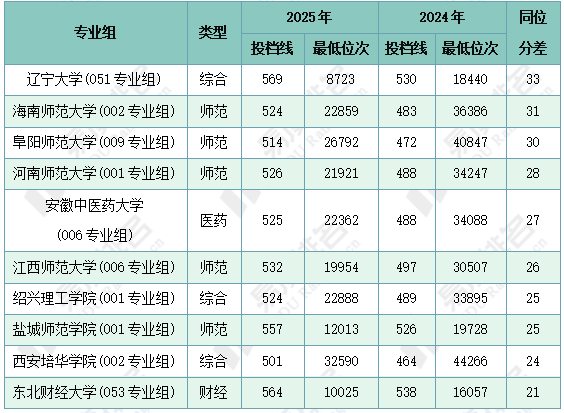 注:1.2024年同位分=2024年投档位次在2025年一分一段表中所对应的分数;2.仅含两年均招生的专业组