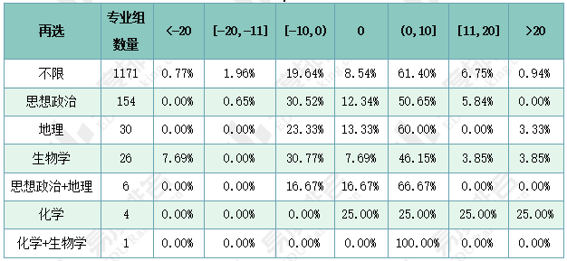 可以看出超90%的院校-专业组与上一年度的同位分差在10分以内,同位分上涨10分以上的专业组数量略多于同位分下降10以上数量,整体报考难度小幅上升。