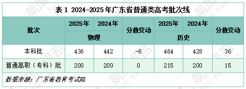 下表为2024-2025年广东省普通类高考本科和专科录取控制分数线。