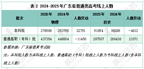 2025年广东省物理类考生在本科阶段的升学优势扩大,而历史类考生面临本科门槛提高、专科竞争加剧的双重压力。