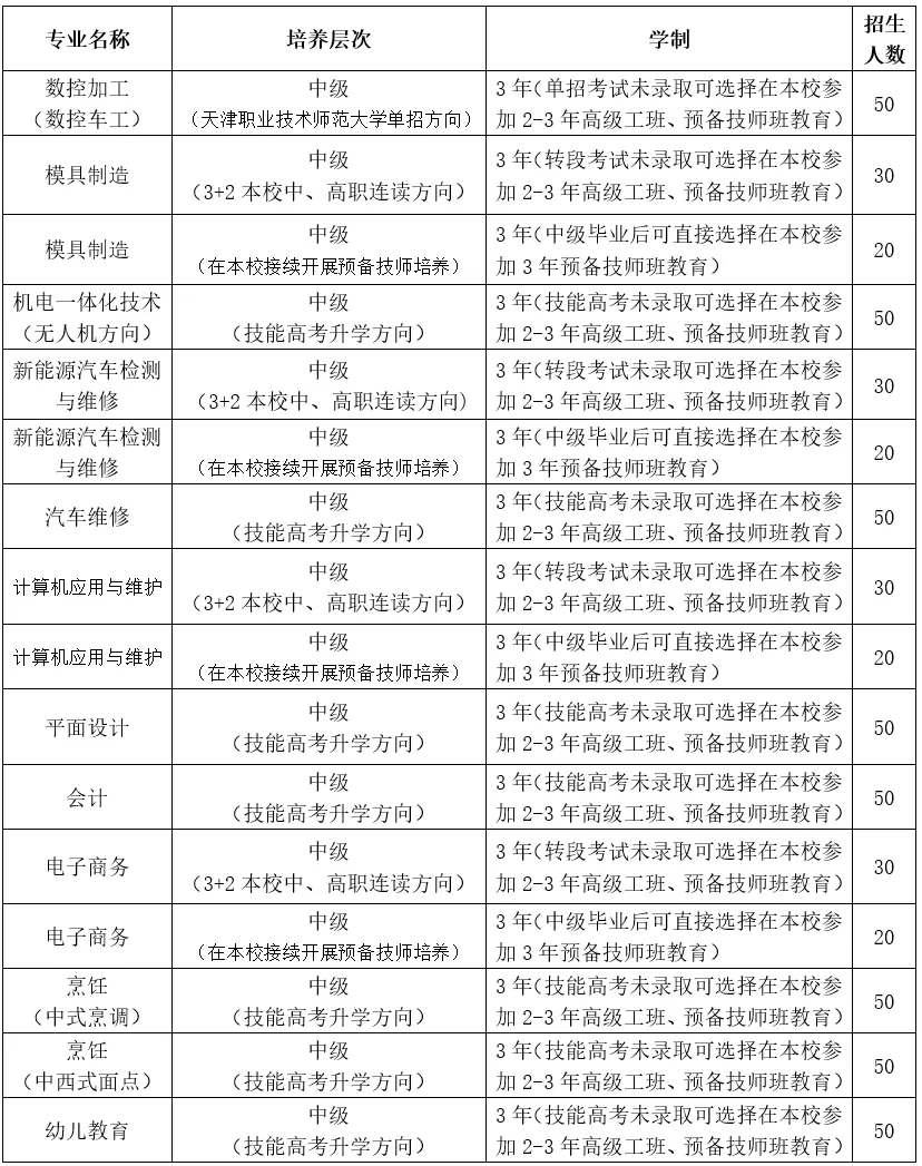 (2)培养方向:在学校就读3年,毕业后可获取技工院校毕业证书(人社部技工院校学籍系统可查询)。第3年下学期参加天津职业技术师范大学组织的单独招生考试,升入天津职业技术师范大学本科。若没被天津职业技术师范大学录取,同时可参加技能高考升入省内高职院校;未能升学的学生,可选择继续在校就读高级班、预备技师班,也可选择由学院推荐就业。