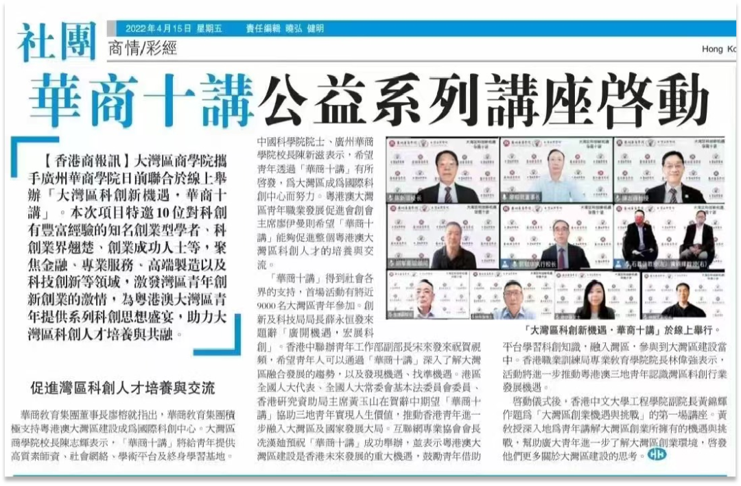 2022年4月至12月,广州华商学院联合大湾区商学院(香港)成功推出首期“华商十讲”——“大湾区科创新机遇•华商十讲”。