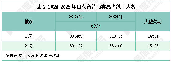 下表为2024-2025年山东省高考普通类1段、2段线上的考生人数。