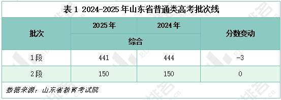 山东普通类1段线为441分,较2024年下降3分,普通类2段线保持150分不变。