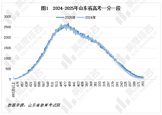 2025年山东省高考试卷难度与去年相近,各分数段的考生人数分布并未发生较大变化。