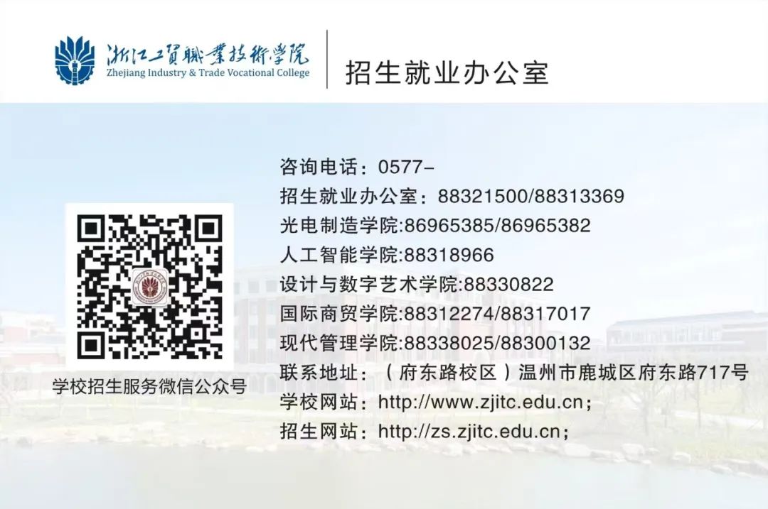 权威发布!浙江工贸职业技术学院2025年普通高校招生章程2025·招考资讯|浙工贸专业全解析,助你找到心之所向!权威发布|浙江工贸职业技术学院2025年招生计划!录取快讯|浙江工贸职业技术学院2025年浙江省单独考试招生录取情况及结果查询2025·招考资讯|浙工贸省内线上线下招生咨询“全攻略”正式开启!提前招生|选择浙工贸的N种可能:优秀在校生到卓越职场人