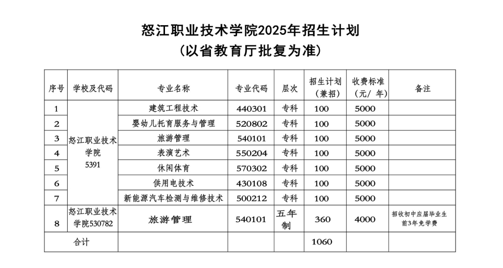 怒江职业技术学院2025年招生简章