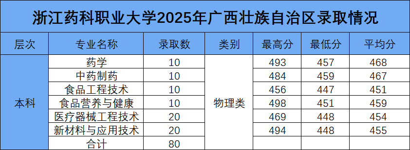 按照广西壮族自治区2025年招生录取进程,浙江药科职业大学在广西壮族自治区本科录取工作已圆满结束。本科招生计划为80人,录取满额完成。