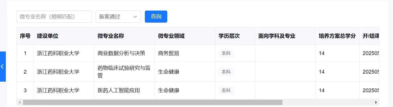 近日,教育部发布《关于上传首批入库“微专业”学生信息的通知》(教就业司函〔2025〕23号),我校申报的商业数据分析与决策、药物临床试验研究与监管、医药人工智能应用三个微专业成功入选,标志着我校在推动专业结构优化、深化产教融合、提升学生就业竞争力方面取得新突破。