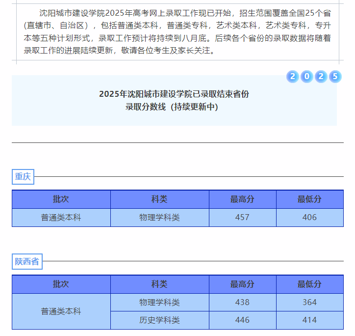 沈阳城市建设学院2025年招生录取进程(7月26日)