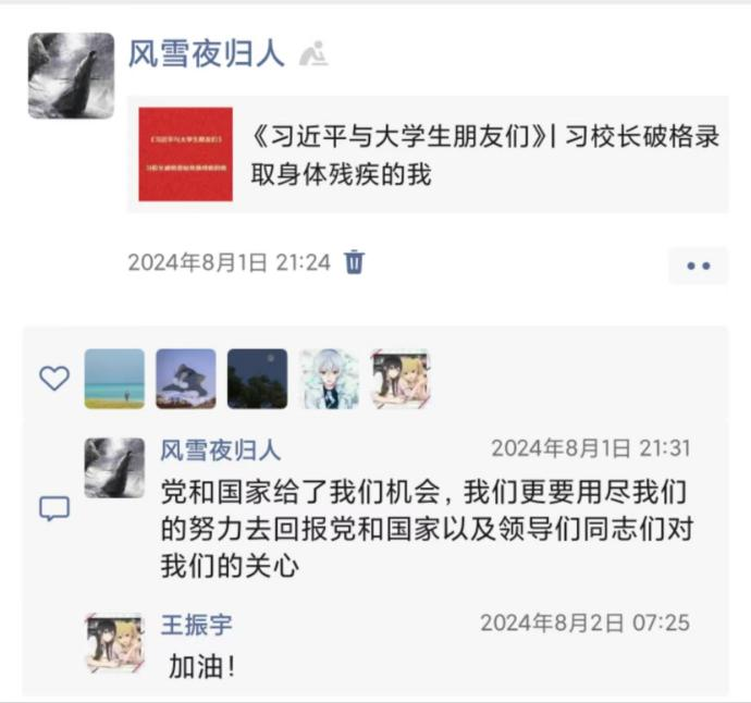 临近毕业时,传媒公司已向他抛出橄榄枝。但图书馆偶然读到的《习校长破格录取身体残疾的我》(载于《习近平与大学生朋友们》)。让他彻夜难眠。