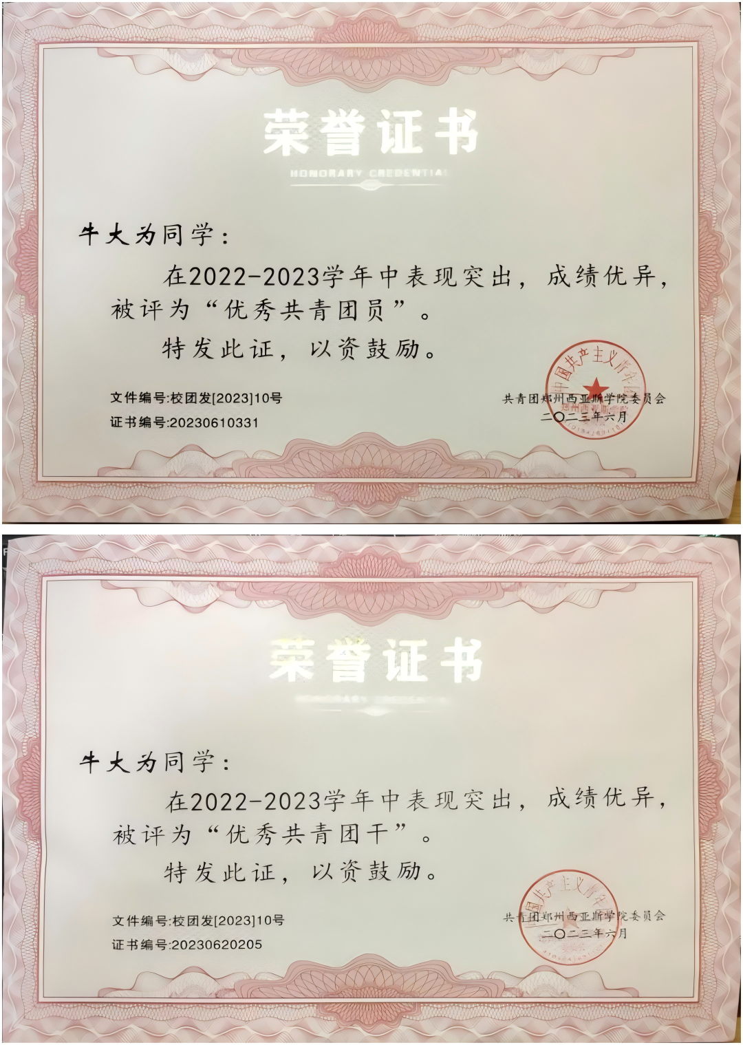 ↑牛大为在校期间所获荣誉