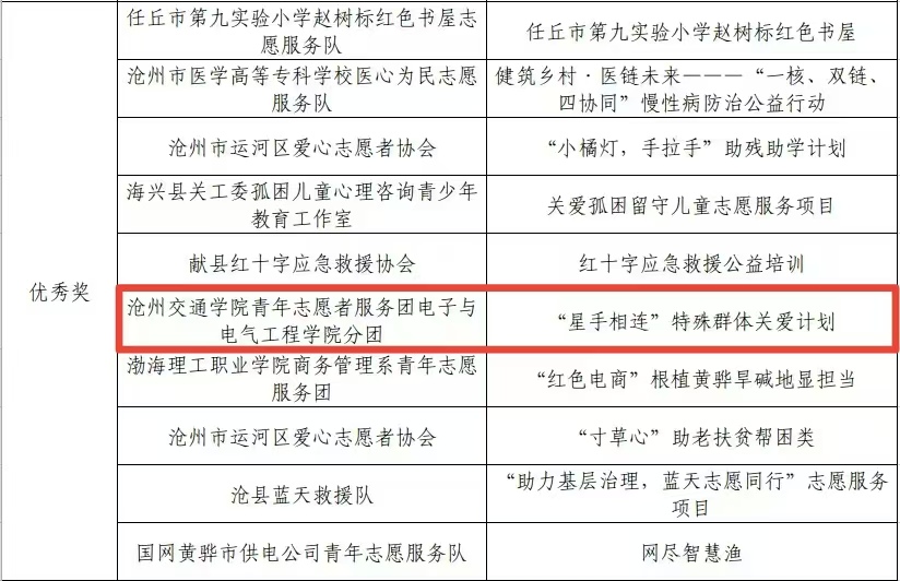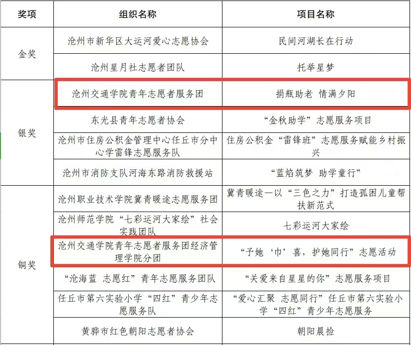 为深入践行新时代志愿服务精神,展现我校青年服务社会的责任担当,7月17日,由共青团沧州市委、中共沧州市委社会工作处、沧州市民政局等单位联合主办的2025年沧州市青年志愿服务项目大赛落幕。经过激烈角逐与严格评审,我校遴选推荐的“捐瓶助老情满夕阳”、“予她‘巾’喜护她同行”、“星手相连”特殊群体关爱计划三个优秀项目入围决赛。