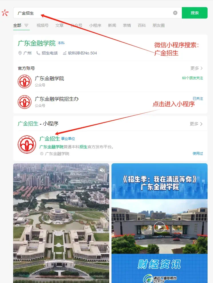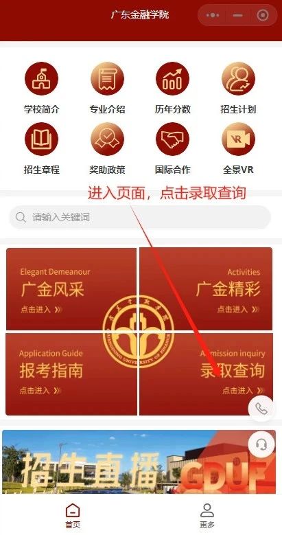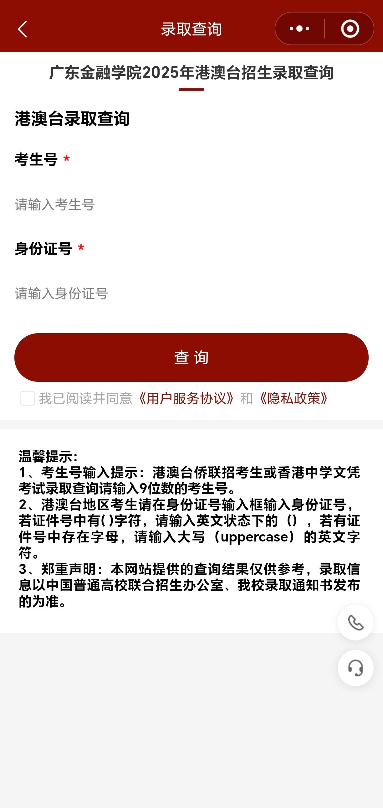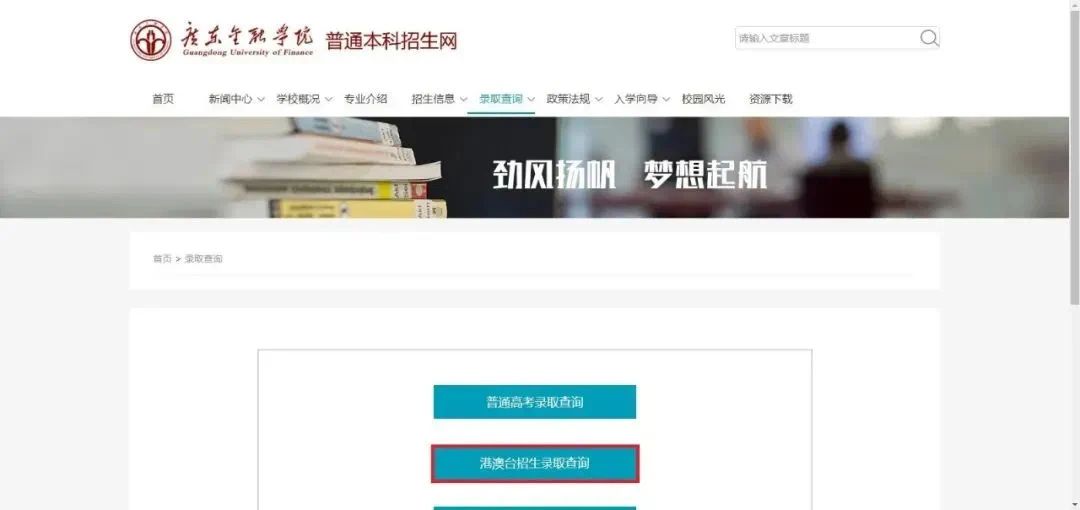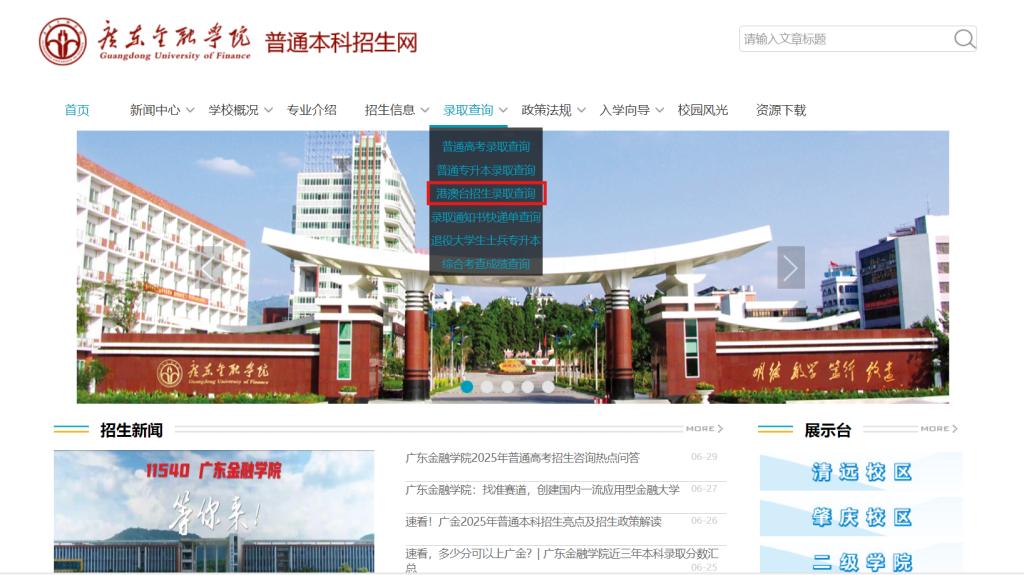通过“广东金融学院招生办”公众号二级菜单“录取查询”跳转至我校普通本科招生网查询。