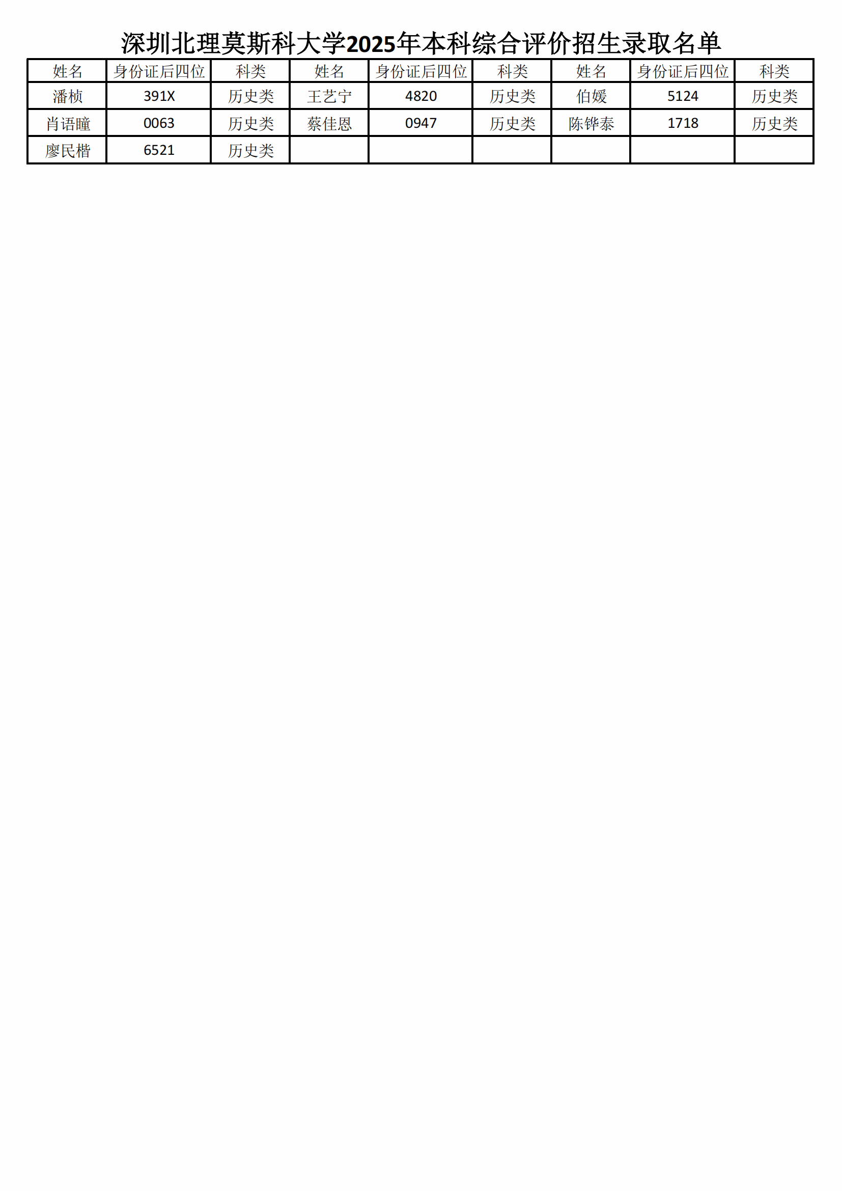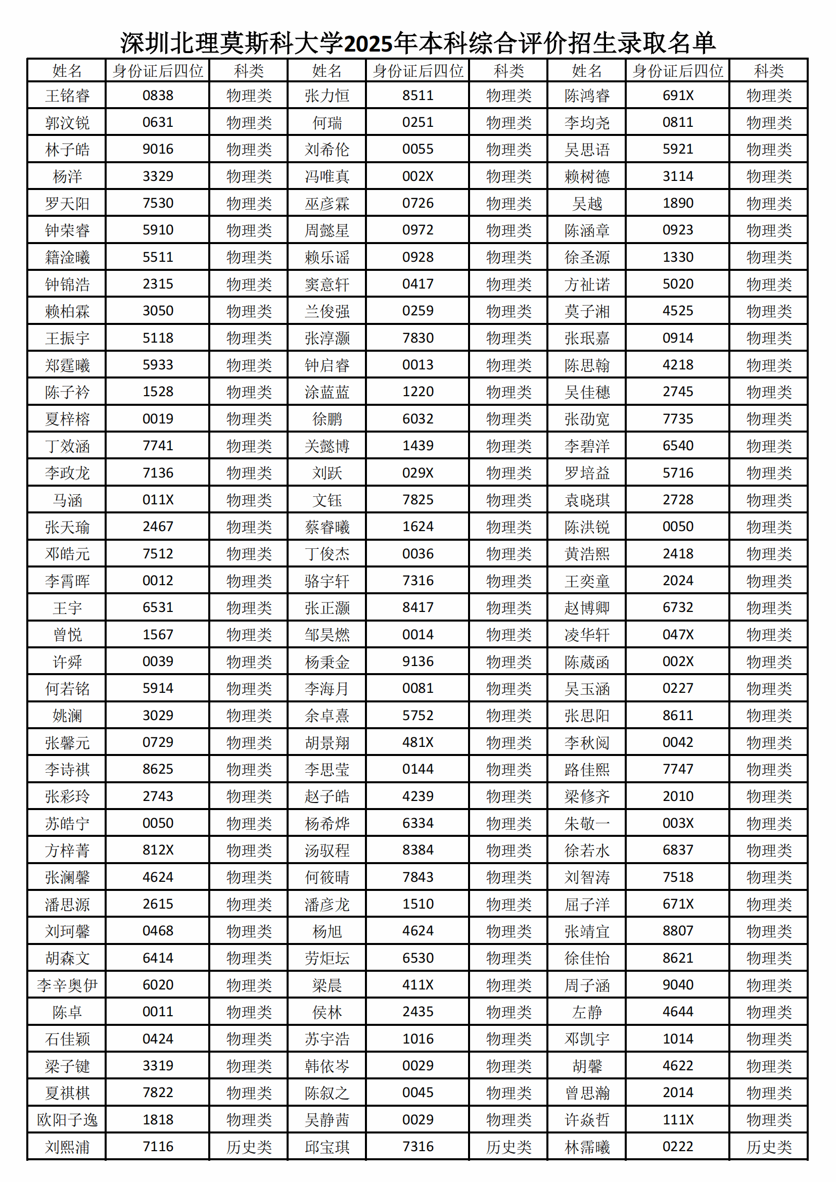 深圳北理莫斯科大学2025年本科综合评价招生录取工作已经结束,现将录取考生名单予以公示。
