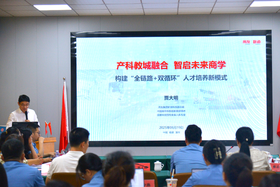 6月19日,用友集团新道科技股份有限公司副总裁贾大明率福州分公司总经理罗永官、副总经理陈娴、校企合作经理俞彬超等一行莅临我校,就深化校企合作、推进数智化商科人才培养等议题与校领导展开深度交流。学校副理事长黄铁枝副研究员热情接待来访团队,校长助理刘富才副研究员、商学院院长陈晓健副教授、副院长蔡志君副教授及相关部门负责人陪同参会。