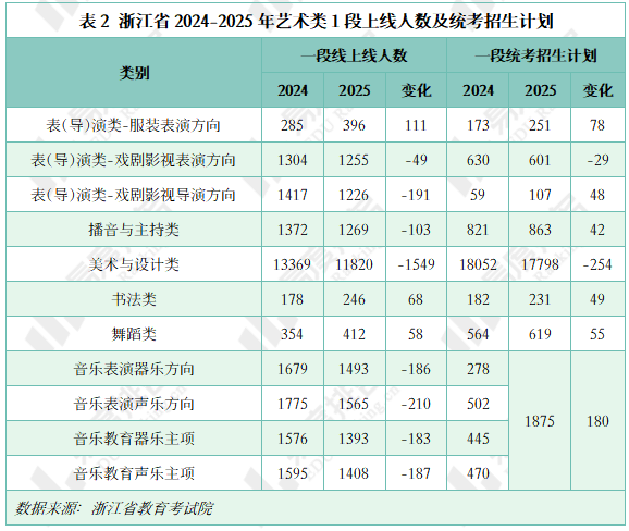 下表展示了浙江省2024-2025年艺术类1段上线人数及统考招生计划。由于表(导)演类-服装