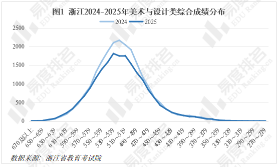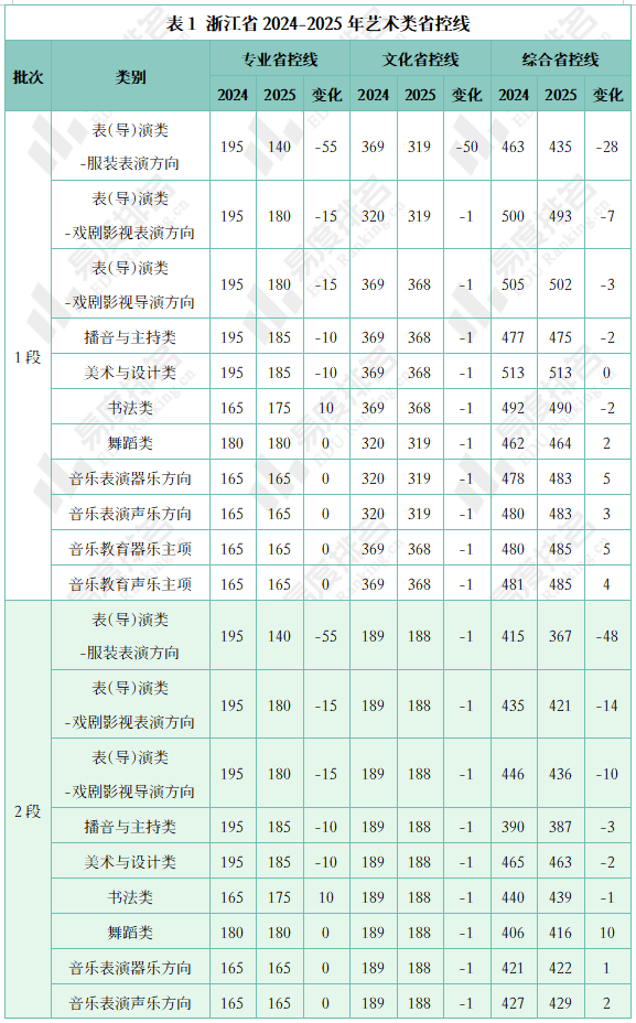 下表展示了浙江省2024-2025年艺术类省控线,可以看出,2025年表(导)演类、