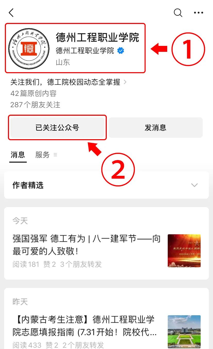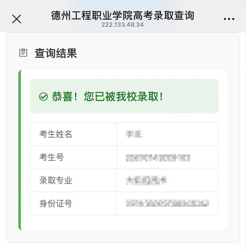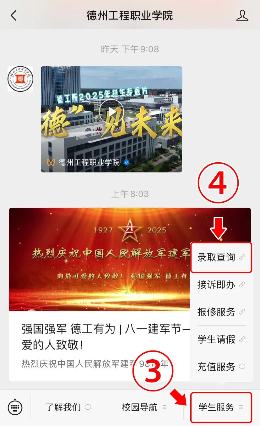 1.微信搜索并关注“德州工程职业学院”公众号,点击右下角“学生服务”,点击“录取查询”,进入查询页面。查询注意事项